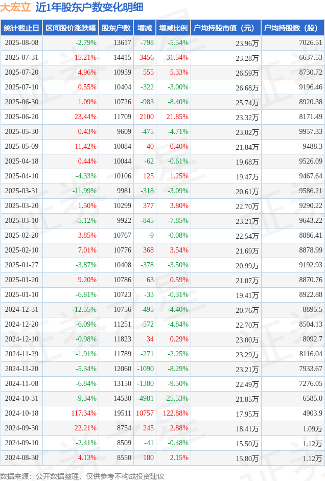 从股价来看,2025年7月31日至2025年8月8日,大宏立区间跌幅为2.79%,在此期间股东户数减少798.0户,减幅为5.54%。
